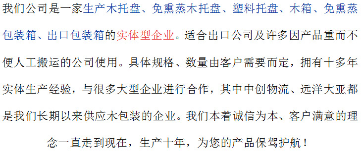 1.你們是木包裝生產(chǎn)廠家還是中間商?? 我們是好的木包裝箱生產(chǎn)廠家,擁有好的木包裝制作團(tuán)隊(duì)。您放心的選擇! 2.木包裝箱承載能力如何?有無蛀蟲?? 木包裝箱具有承載量大、免熏蒸,實(shí)木包裝可提供薰蒸證明。 3.木包裝箱下單后何時(shí)發(fā)貨? 根據(jù)客戶下單數(shù)量,下單日起,我們隨時(shí)跟客戶保持密切的聯(lián)系盡快發(fā)貨。 4.發(fā)貨費(fèi)用如何定制?? 根據(jù)客戶每次訂購(gòu)數(shù)量來決定,木托盤屬于重貨,如需含運(yùn)費(fèi),我們也可以給出含運(yùn)費(fèi)的價(jià)格。具體詳情請(qǐng)咨詢客服。 5.木包裝箱價(jià)格如何計(jì)算? 木包裝箱根據(jù)您所要的長(zhǎng)度寬度厚度,每次訂單的數(shù)量以及是否含稅含運(yùn)費(fèi)來核算 黃島膠合板木箱 青島港口真空包裝箱 大型設(shè)備物流維修免熏蒸木箱